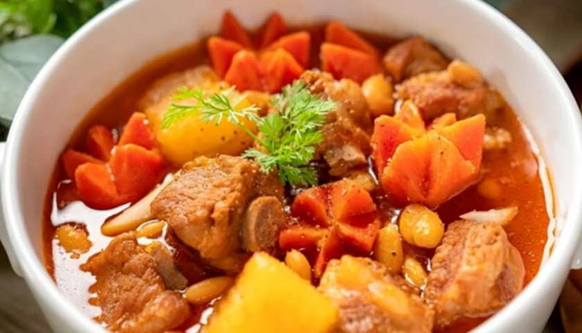 Đừng quên cho đậu trắng vào nồi và tiếp tục hầm thêm 30 phút nữa. Cuối cùng, thêm cà rốt, khoai lang và hành tây để tạo màu sắc và hương vị hấp dẫn. Thành phẩm không chỉ ngon mà còn bổ dưỡng, rất thích hợp cho những bữa ăn sum họp bên gia đình.