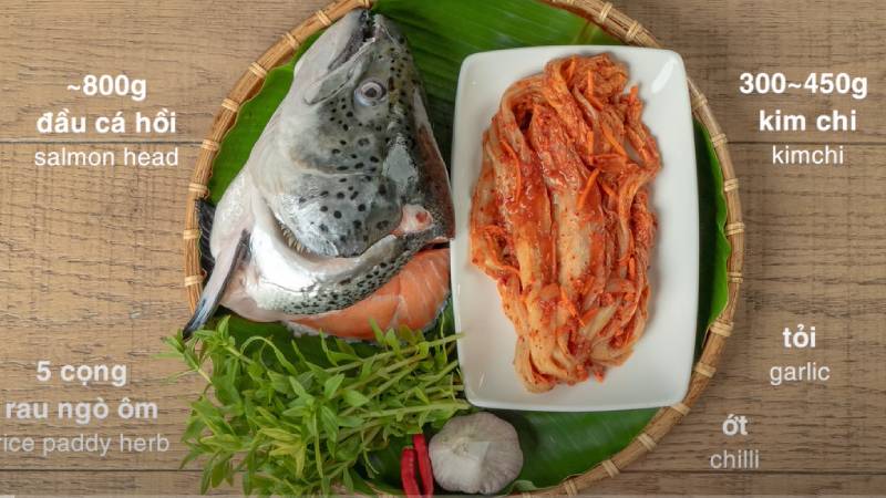 Nếu bạn muốn trổ tài nấu món canh cá hồi kim chi đầy hấp dẫn, hãy bắt đầu bằng cách chuẩn bị đầy đủ nguyên liệu. Đầu tiên, bạn cần 800g đầu cá hồi, 350-400g kim chi cải thảo, 5 cọng ngò ôm, cùng với tỏi và ớt để tạo thêm hương vị. Đừng quên gia vị như dầu ăn, nước mắm, hạt nêm và đường.