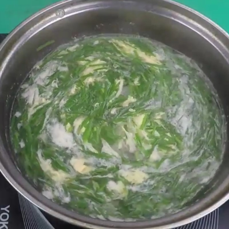 Tiếp theo, bắc nồi lên bếp, cho khoảng 250ml nước vào và đun sôi. Khi nước sôi, nhẹ nhàng cho lá hẹ vào nồi, đảo đều rồi đậy nắp lại. Nấu với lửa lớn khoảng 1 phút đến khi hẹ chuyển màu xanh đậm. Sau đó, bạn cho 1 quả trứng đã đánh tan với nước mắm vào, khuấy nhẹ cho trứng hòa quyện với canh.