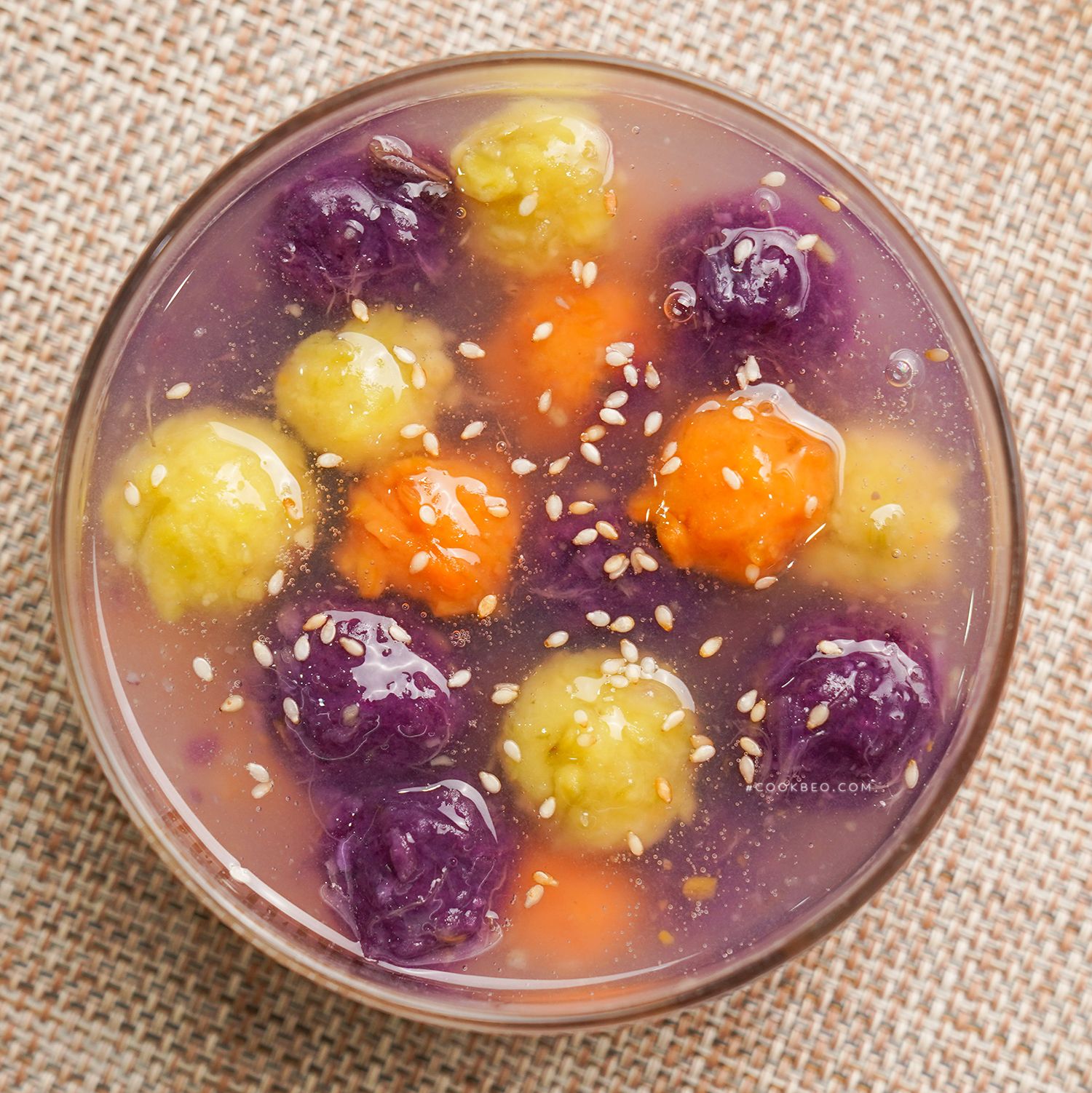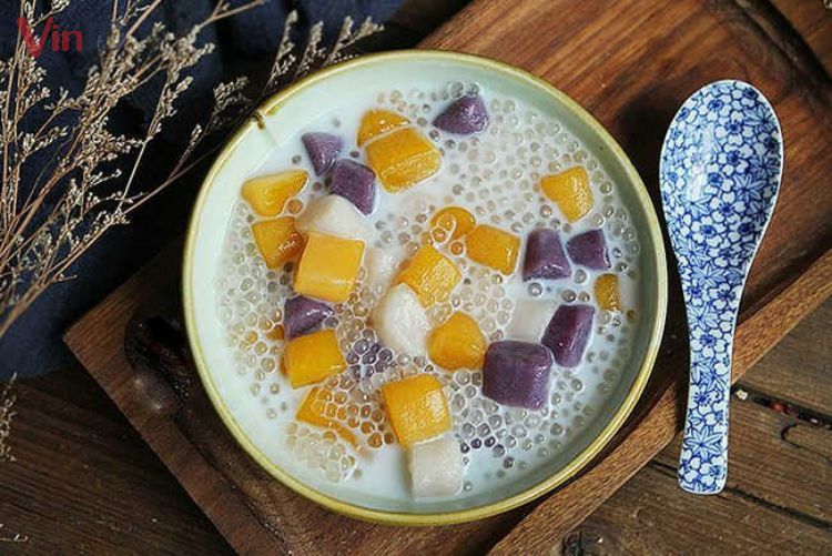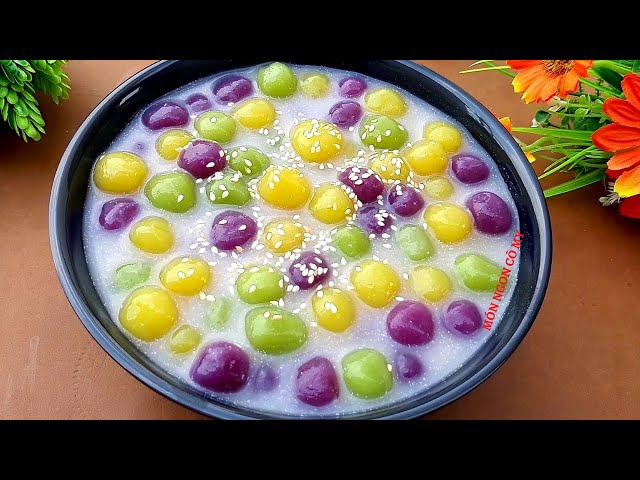 Khi khoai đã chín, bạn trộn đều với 340g bột năng và 150g đường, thêm một chút muối để tạo vị. Tiếp theo, nhồi hỗn hợp này thành những viên tròn nhỏ, sau đó cho vào nồi nước sôi để chúng nổi lên. Để làm nước dừa chan, bạn có thể nấu 170ml nước cốt dừa cùng với chút muối và đường, tạo ra hương vị béo ngậy.