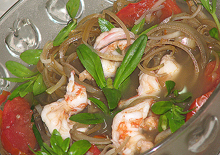 Khi nước sôi, cho cà chua, mẻ và các loại rau thơm như rau om, ngò gai vào cùng với hoa chuối đã sơ chế. Đảo đều và nêm nếm cho vừa ăn. Chỉ sau vài phút, bạn đã có một món ăn tuyệt vời để thưởng thức cùng gia đình và bạn bè.