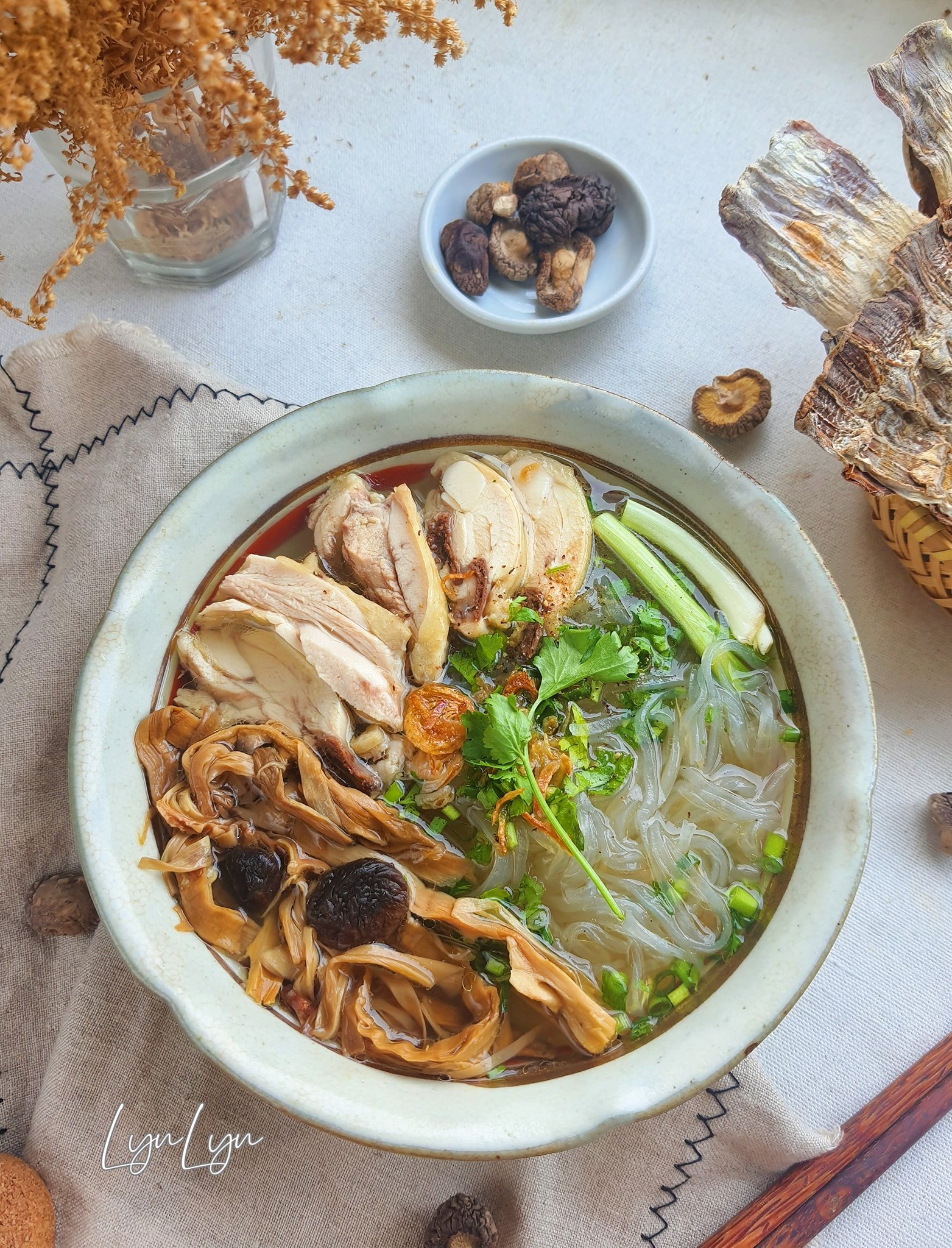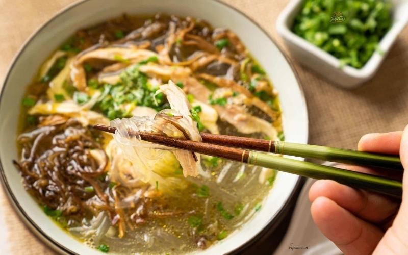 Nước lèo được hầm từ xương gà cùng với hành và gừng để mang lại hương vị đậm đà, ấm áp. Trong khi đó, măng khô cũng được chế biến kỹ lưỡng để tránh vị đắng. Khi tất cả nguyên liệu đã chuẩn bị xong, hãy cho miến vào nấu chín, sau đó thêm gà xé, măng xào và một chút hành lá lên trên.