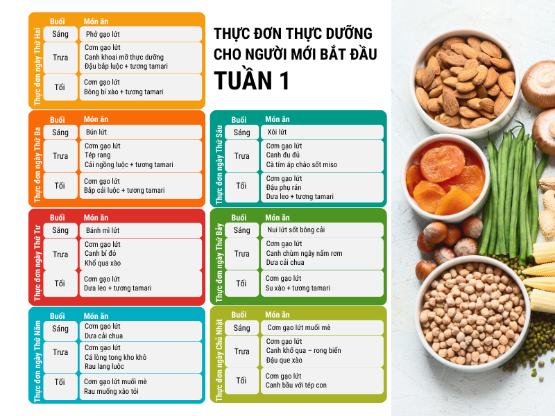 Chế độ ăn thực dưỡng không chỉ là lựa chọn các thực phẩm tự nhiên như ngũ cốc, rau củ mà còn là cách kết hợp để tạo ra những bữa ăn đầy đủ dinh dưỡng. Bạn có thể bắt đầu ngày mới với một bát cháo gạo lứt và muối mè, kèm theo bữa trưa nhẹ nhàng với cơm gạo lứt và rau luộc. Vào buổi tối, một chén súp miso sẽ giúp bạn thư giãn và dễ tiêu hóa.