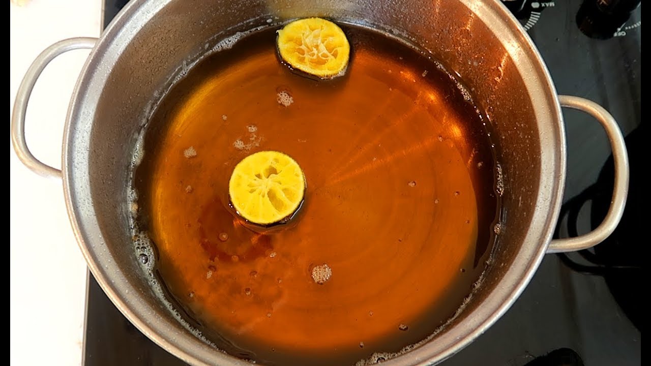 Khi bắt đầu, hãy đặt nồi lên bếp, cho nước và đường vào rồi đun với lửa nhỏ. Lưu ý quan trọng là tuyệt đối không khuấy trong suốt quá trình nấu, kể cả khi bạn thêm chanh. Khi nửa quả chanh chuyển màu vàng, hãy vớt bỏ chúng ra để tránh nước đường bị chua. Đun cho đến khi nước đường sánh lại như mật là bạn đã thành công.