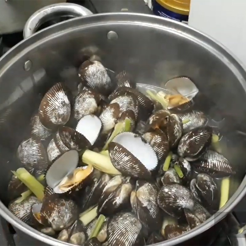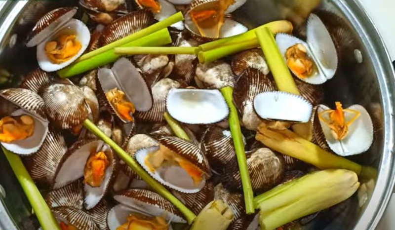 Tiếp theo, bật bếp với lửa lớn, cho 1 kg sò lông vào nồi cùng với một lít nước. Thêm sả và ớt đã chuẩn bị vào, sau đó đậy nắp lại để hấp cho đến khi sò mở ra. Thời gian hấp thường khoảng 10 phút, nhưng bạn nên xóc đều sò lên một lần để đảm bảo những con sò ở dưới cũng được chín đều.