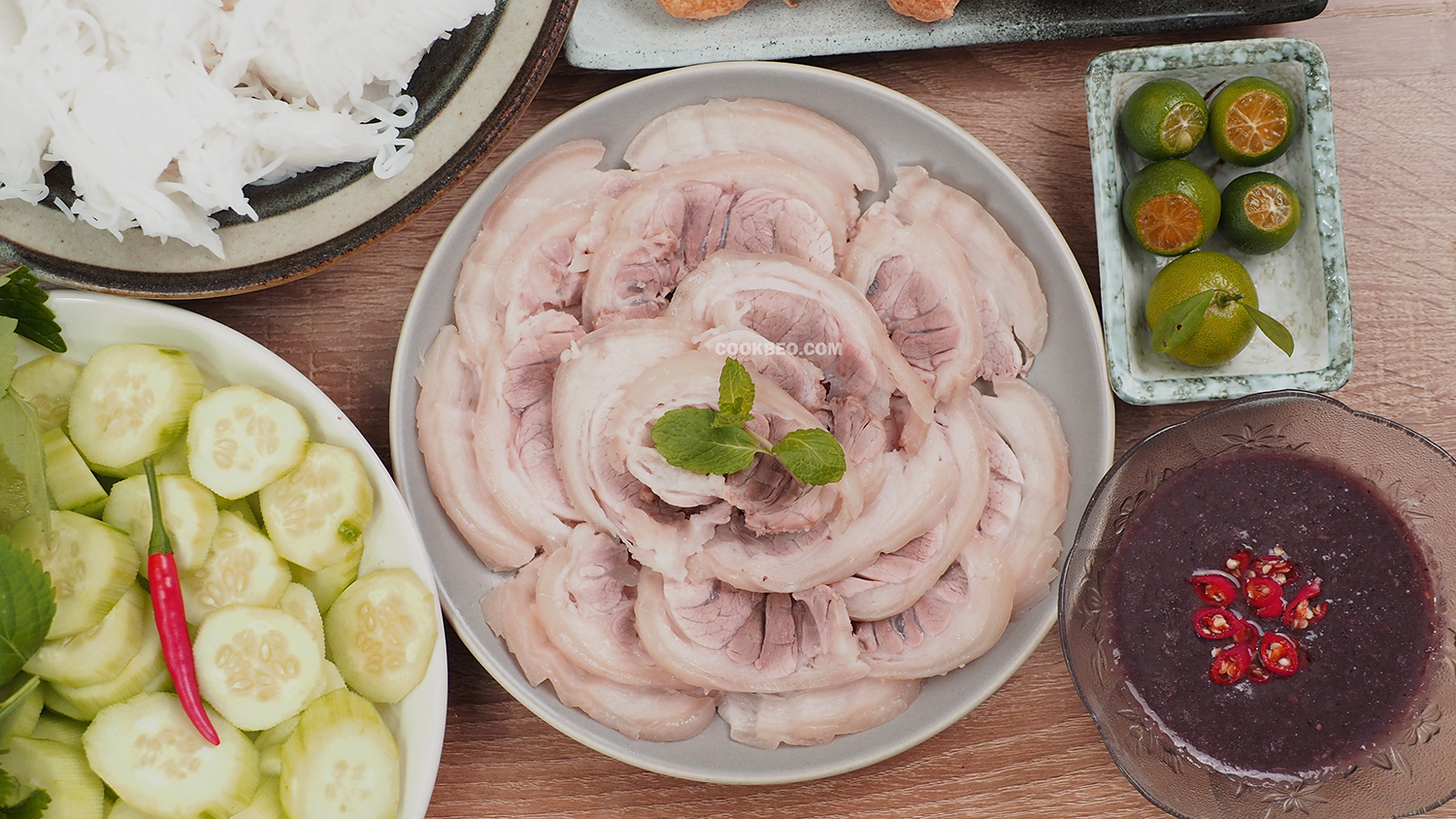 Sau khi pha xong, bạn có thể làm thịt luộc bằng cách sử dụng khoảng 500g thịt ba chỉ cùng với hành tím, gừng, muối và hạt nêm. Luộc thịt cho đến khi chín mềm rồi thái lát mỏng. Món thịt luộc sẽ ngon hơn khi ăn kèm với một đĩa rau sống và cà pháo.