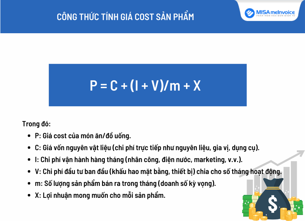 Điều quan trọng trong việc tính giá cost là dựa trên khả năng sinh lời. Nghĩa là, cần xem xét doanh số kỳ vọng và số lượng sản phẩm sẽ tiêu thụ trong một khoảng thời gian nhất định. Trong trường hợp các món ăn, công thức đơn giản mà nhiều nhà hàng sử dụng là: Giá cost món ăn = Chi phí thực phẩm / % chi phí thực phẩm. Tỷ lệ này thường được điều chỉnh linh hoạt tùy thuộc vào quy mô và chiến lược của từng quán.