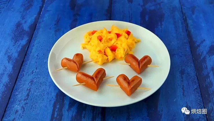 Trang trí đĩa xúc xích cho bé không chỉ giúp món ăn thêm hấp dẫn mà còn kích thích sự sáng tạo của trẻ. Một trong những cách đơn giản là uốn cong lườn ngoài của xúc xích thành hình trái tim. Bạn chỉ cần dùng tăm xiên để cố định hình dáng này. Điều này không chỉ tạo sự mới mẻ mà còn khiến bữa ăn trở nên thú vị hơn cho các bé.