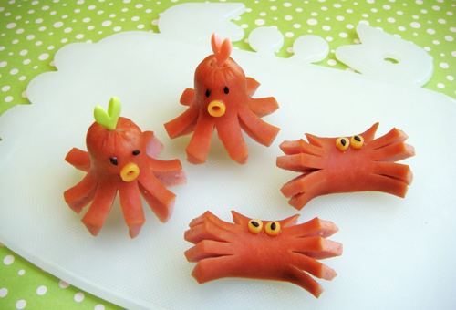 Ngoài hình hoa hồng, bạn còn có thể thử sức với các hình như bạch tuộc, hình trái tim hay những con vật ngộ nghĩnh. Ví dụ, khi tạo hình bạch tuộc, chỉ cần khứa vài đường dưới xúc xích để tạo chân và chiên chúng. Chắc chắn rằng trẻ sẽ thích thú khi thấy đĩa ăn của mình tràn đầy sắc màu và hình dáng đáng yêu như vậy!