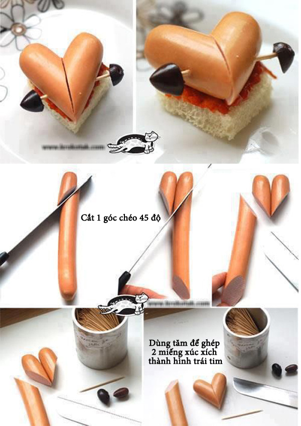 Trang trí xúc xích với rau củ không chỉ làm món ăn thêm hấp dẫn mà còn mang lại sự sáng tạo cho bữa ăn gia đình. Một cách đơn giản nhưng hiệu quả là cắt lườn ngoài của xúc xích, uốn cong thành hình trái tim và dùng tăm xiên để cố định. Hình dáng trái tim sẽ làm bữa ăn trở nên ấn tượng, đặc biệt với trẻ nhỏ.
