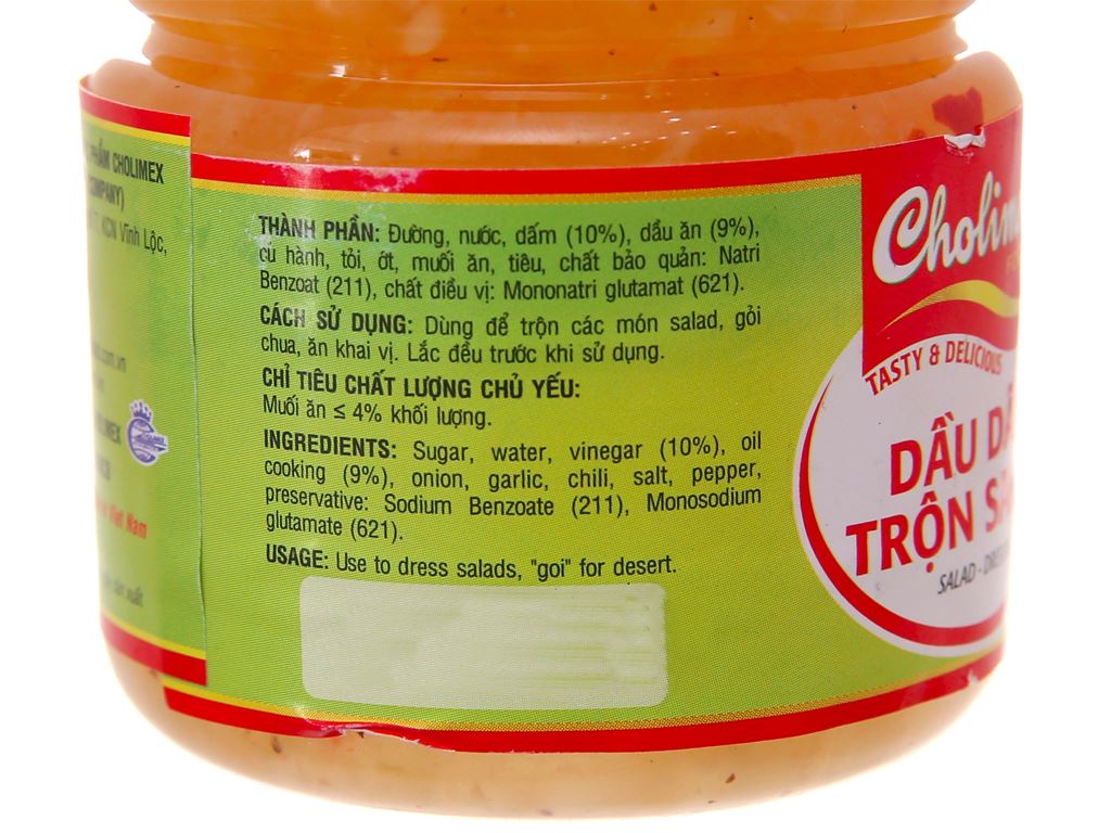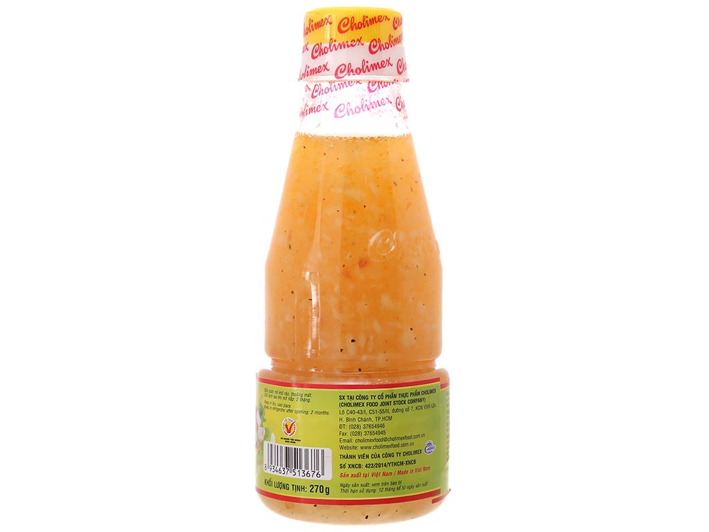 Chai dầu giấm trộn salad Cholimex 270g là một gia vị tuyệt vời cho những ai yêu thích các món ăn tươi mát như salad hay gỏi. Sản phẩm được chế biến từ các nguyên liệu tự nhiên như nước, đường, giấm, dầu ăn, cùng với củ hành, tỏi, ớt, tạo nên hương vị thơm ngon, hấp dẫn mà không cần phải băm hay trộn lẫn các thành phần phức tạp.