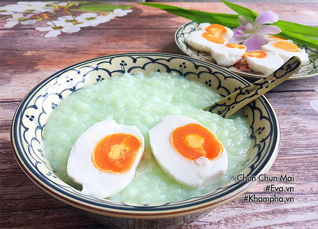 Tiếp theo, chúng ta sẽ nấu cháo. Bắt một nồi lên bếp với lửa vừa, cho vào nồi khoảng nửa chén gạo cùng với 1,5 đến 2 lít nước. Sau khi gạo đã nở mềm, hãy cho trứng vịt muối đã sơ chế vào, khuấy đều để các hương vị hòa quyện. Kuching một chút hành tím, hành lá cắt nhỏ lên trên vừa để trang trí, vừa tạo mùi thơm.