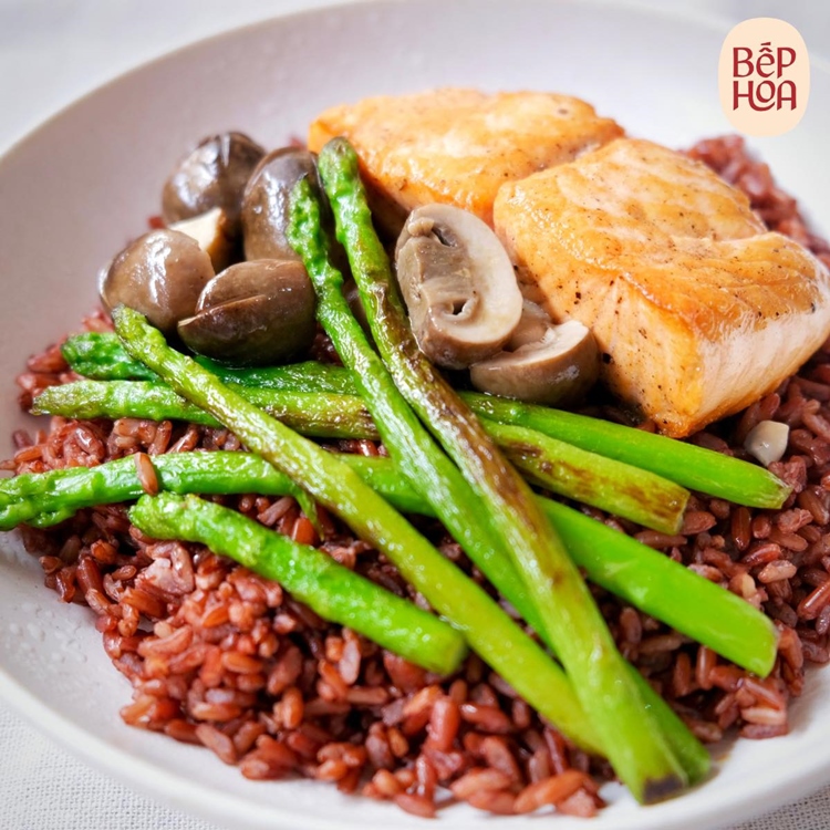 Cơm gạo lứt cá hồi áp chảo là một món ăn hấp dẫn, vừa giàu dinh dưỡng vừa ngon miệng. Phần thăn cá hồi dày mình được áp chảo thơm nức, mang đến hương vị béo ngậy đặc trưng. Khi ăn kèm với măng tây và nấm tươi, món ăn trở nên cân đối hơn, hòa quyện giữa vị của cá và độ giòn của rau.