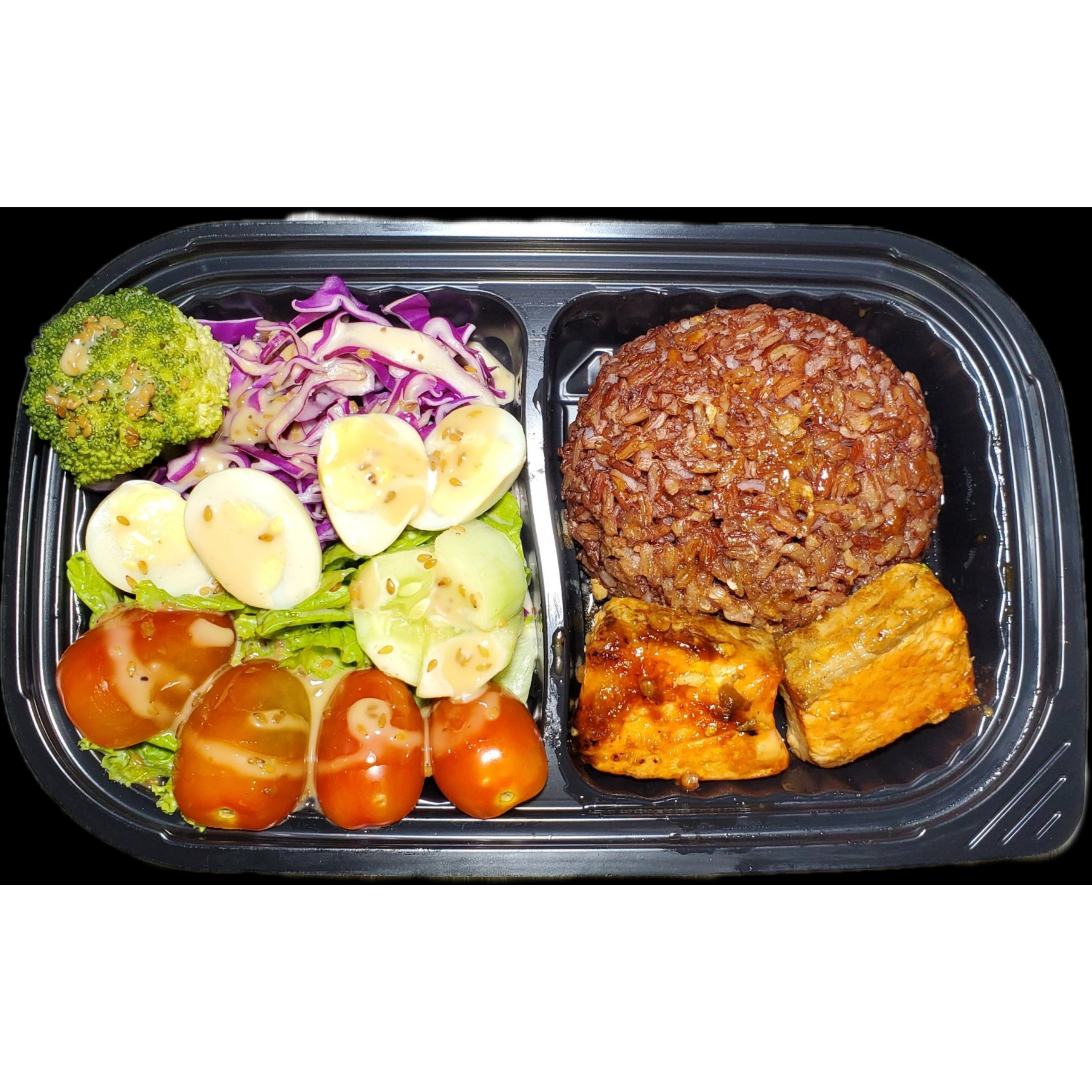 Nếu bạn đang tìm kiếm một món ăn vừa ngon miệng vừa tốt cho sức khỏe, thì cơm gạo lứt cá hồi là một lựa chọn tuyệt vời. Một phần cơm này chỉ chứa khoảng 310 calo, rất hợp lý cho bữa ăn trong ngày. Thành phần chính bao gồm cá hồi sốt teriyaki, cơm gạo lứt và rau củ luộc theo mùa, mang lại sự hòa quyện tuyệt vời giữa hương vị và giá trị dinh dưỡng.