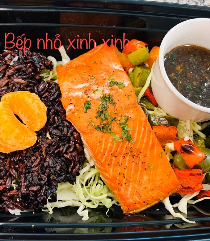 Một phần cơm gạo lứt cá hồi không chỉ đơn thuần là món ăn mà nó còn cung cấp khoảng 470 calories, rất phù hợp cho những ai quan tâm đến sức khỏe mà vẫn muốn thưởng thức các món ngon. Nguyên liệu chính bao gồm gạo lứt đen, ngô hạt, đậu hà lan và nhiều loại rau củ khác, tạo nên sự phong phú cho bữa ăn.