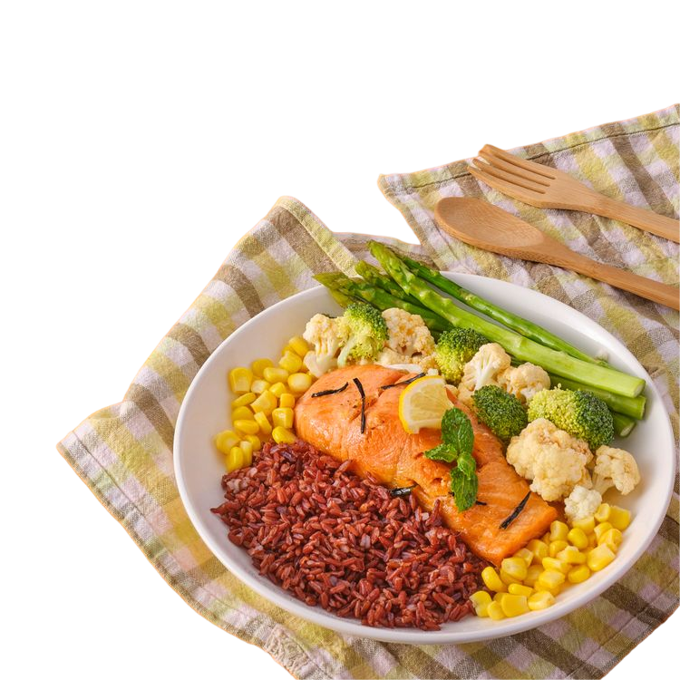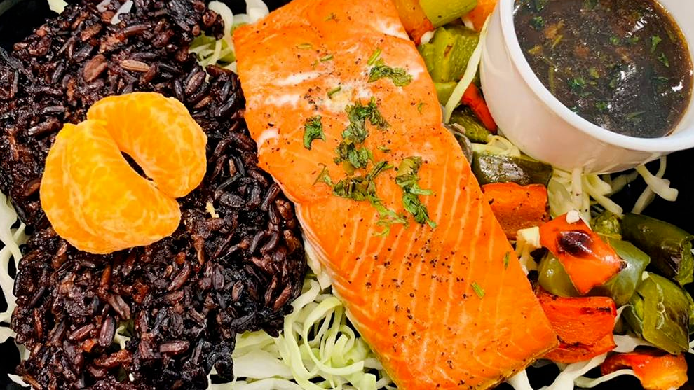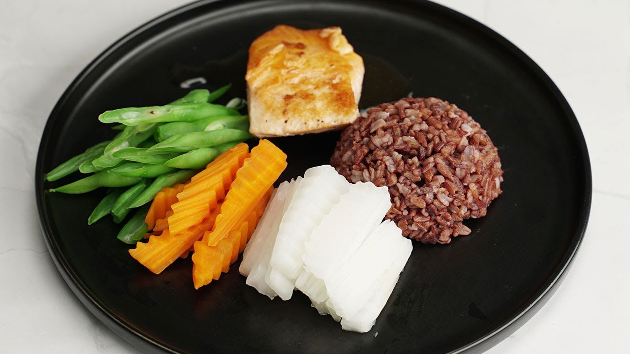 Cơm gạo lứt cá hồi áp chảo là một món ăn hấp dẫn, rất phù hợp cho những ai đang theo đuổi chế độ ăn kiêng. Miếng thăn cá hồi dày mình được áp chảo thơm nức, kết hợp cùng măng tây và nấm tươi mang lại hương vị hoàn hảo cho bữa ăn. Gạo lứt tím dẻo đầy dinh dưỡng không chỉ ngon mà còn tốt cho sức khỏe.