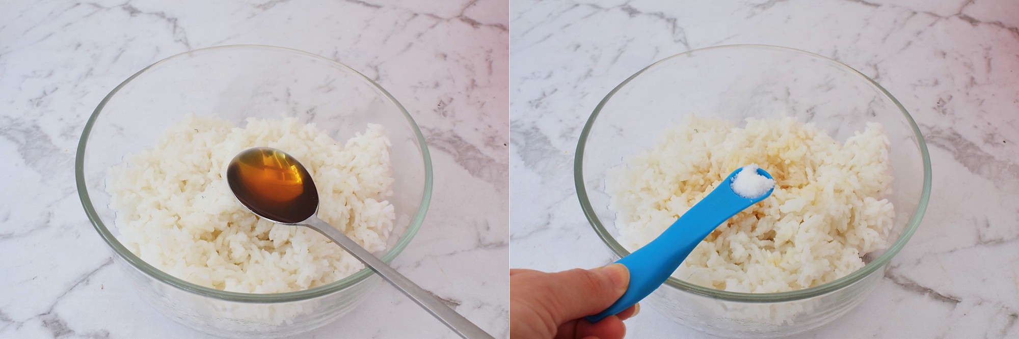 Khi chế biến cơm cuộn, bạn chỉ cần cho cơm vào bát, thêm dầu mè và muối rồi trộn đều. Hãy đảm bảo cơm được nấu chín, sau đó để nguội và trộn với mè trắng, mè đen đã rang. Việc sử dụng một muỗng cà phê dầu mè không chỉ giúp cơm dính với lá rong biển mà còn mang lại mùi thơm đặc trưng, kết hợp hoàn hảo với các loại rau củ như cà rốt, dưa leo hay đậu que.