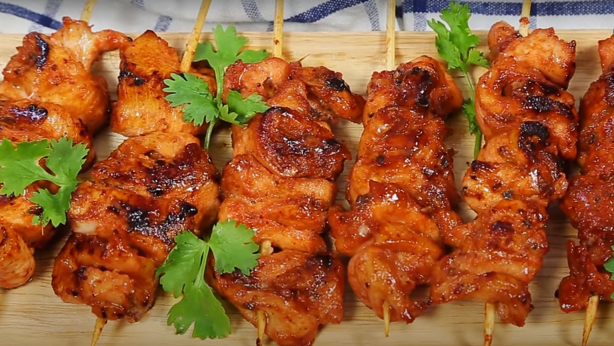 Thịt gà có thể chọn đùi hoặc ức tùy theo sở thích. Khi đã ướp đủ thời gian, xếp thịt gà lên que xiên cùng các loại rau củ như ớt chuông, hành tây hay bí đỏ. Nướng trên vỉ cách than khoảng 15–20cm, nhớ trở mặt thường xuyên và phết thêm mật ong để có màu vàng đẹp mắt.