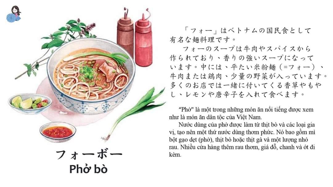 Món ăn Việt Nam không chỉ nổi tiếng với sự đa dạng mà còn được yêu thích bởi hương vị tuyệt hảo. Nếu bạn muốn giới thiệu món ăn Việt bằng tiếng Nhật, hãy bắt đầu với những từ vựng cơ bản như 食べ物 (tabemono) nghĩa là thức ăn và 料理 (ryouri) cho món ăn. Khi bạn muốn chia sẻ sở thích của mình, hãy nói “好きな料理は何ですか?” (Dona ryouri ga ichiban suki desu ka?) tức là “Bạn thích món nào nhất?”.