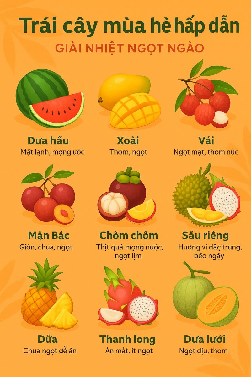 Mùa hè đến, tạo cơ hội để chúng ta thưởng thức những loại trái cây tươi ngon, không chỉ ngon miệng mà còn giúp giải nhiệt và bổ sung nước cho cơ thể. Dưa hấu – được mệnh danh là “vua giải nhiệt”, là lựa chọn hàng đầu với vị ngọt mát và nhiều nước. Ngoài ra, xoài chín mọng, với hương vị thơm ngon, cũng là một trong những loại trái cây không thể bỏ qua.