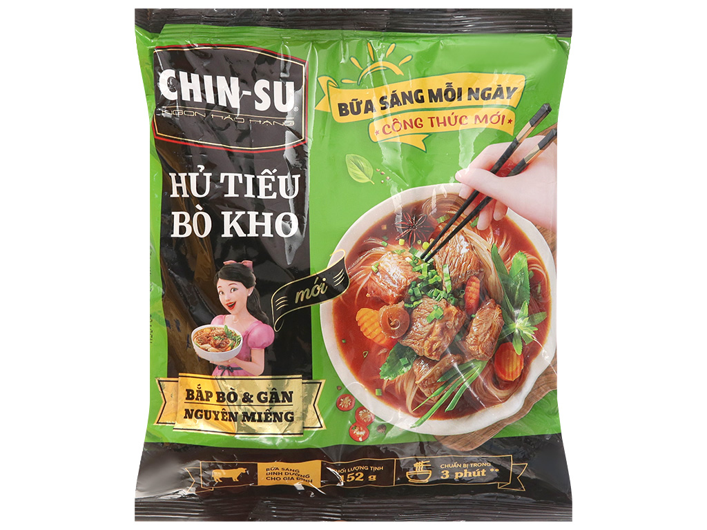 Điểm đặc biệt của sản phẩm này chính là gói bắp bò và gân bò nguyên miếng. Khi thưởng thức, bạn sẽ cảm nhận được vị ngọt tự nhiên của thịt bò, hòa quyện cùng nước dùng thơm lừng, rất đã miệng. Hủ tiếu Bò Kho Chinsu không chỉ ngon mà còn đảm bảo an toàn vệ sinh thực phẩm với chất lượng cao.