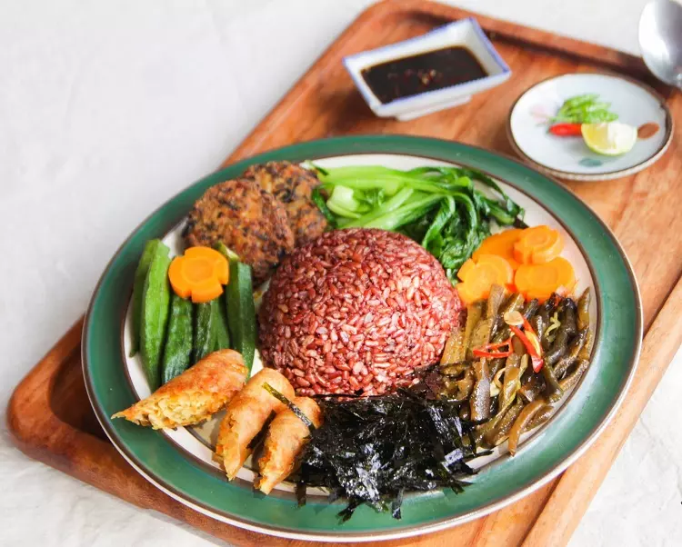 Bữa trưa, chúng ta có thể thưởng thức một chén cơm lứt mè trắng, ăn kèm rau củ kho tương tamari và canh tam sắc hữu cơ. Những món ăn này không chỉ ngon miệng mà còn bổ sung nhiều chất xơ, vitamin và khoáng chất cần thiết cho cơ thể. Đừng quên nhâm nhi một tách trà lá sen để thanh lọc cơ thể.