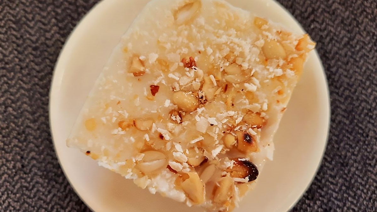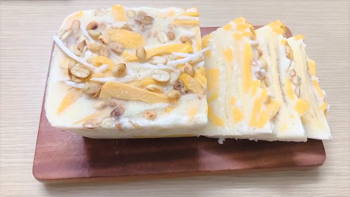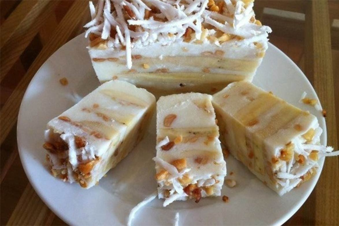 Để tạo ra hỗn hợp kem đặc sệt, hãy hòa bột năng với một ít nước, sau đó đổ vào nồi nước cốt dừa và khuấy đều cho đến khi đạt độ sệt mong muốn. Đến lúc này, bạn có thể bắt tay vào làm kem: xếp chuối vào hộp, rưới nước cốt dừa lên, rồi thêm một lớp đậu phộng rang đã giã nát và dừa nạo sợi.