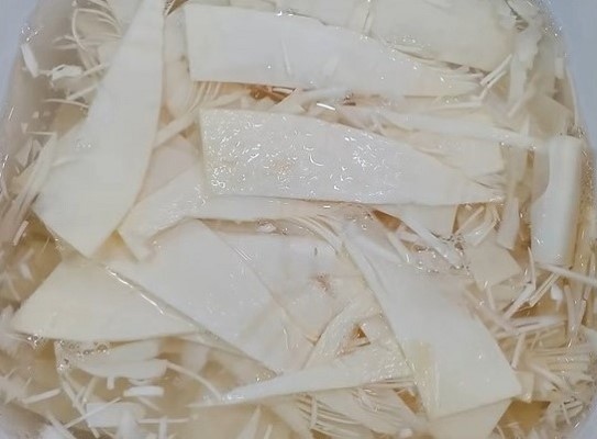 Ngoài ra, bạn cũng có thể sử dụng hỗn hợp nước vo gạo và muối để ngâm. Phương pháp này không chỉ giúp măng mềm mà còn khử độc tố hiệu quả, ngăn ngừa hiện tượng măng bị đen hay lên váng. Sau khi ngâm, nhớ rửa sạch măng và trần qua nước sôi để đảm bảo an toàn.