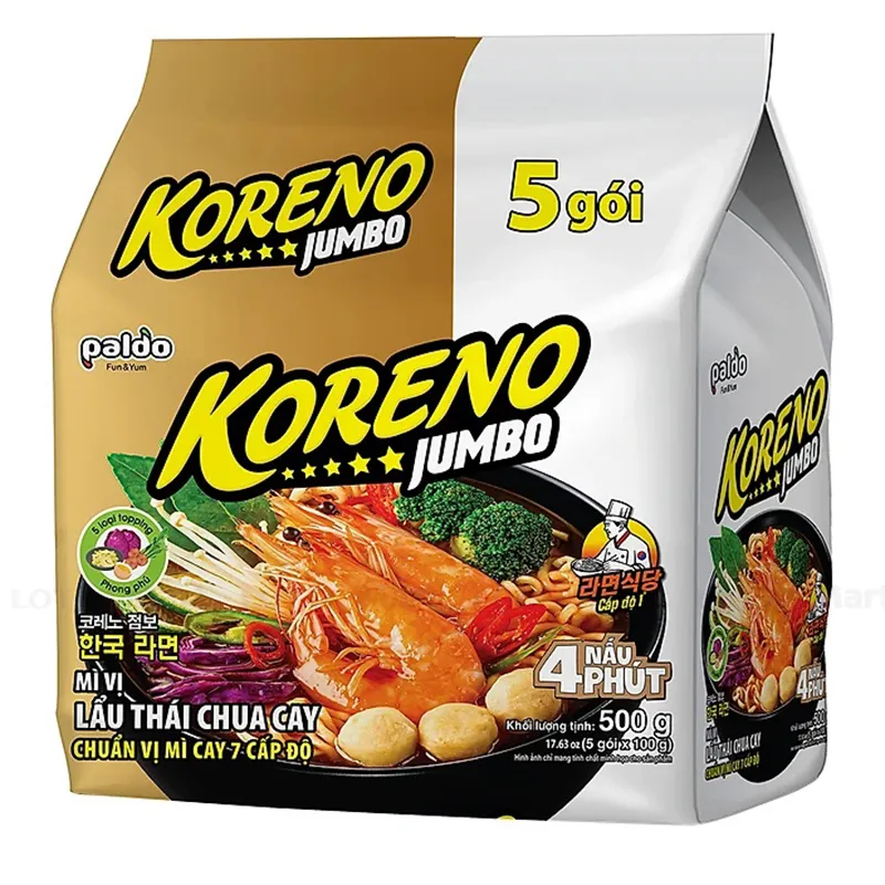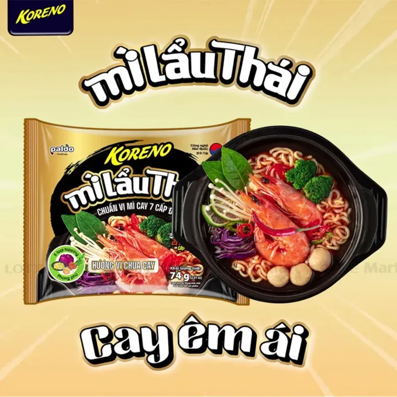 Điểm nhấn đặc biệt của Mì Lẩu Thái Koreno chính là sự kết hợp của bốn loại topping phong phú, từ tôm đến rau sấy khô, mang đến sự phong phú cho mỗi miếng mì. Đây chính là lựa chọn lý tưởng cho những bữa tối thư giãn hoặc khi bạn muốn thưởng thức một món ăn ngon mà không mất quá nhiều thời gian chế biến. Cảm nhận độ cay nhẹ nhàng cùng vị chua thanh mát, bạn sẽ ngỡ như đang thưởng thức một nồi lẩu đúng nghĩa.