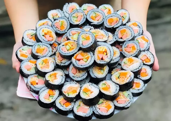 Tiếp theo, xào chín các nguyên liệu như xúc xích và cà rốt cho thật hấp dẫn. Khi mọi thứ đã sẵn sàng, trải lá rong biển lên bề mặt phẳng, sau đó cho cơm và các nguyên liệu đã chuẩn bị lên trên. Cuối cùng, bạn chỉ cần cuộn lại thật chặt, cắt thành từng miếng vừa ăn.