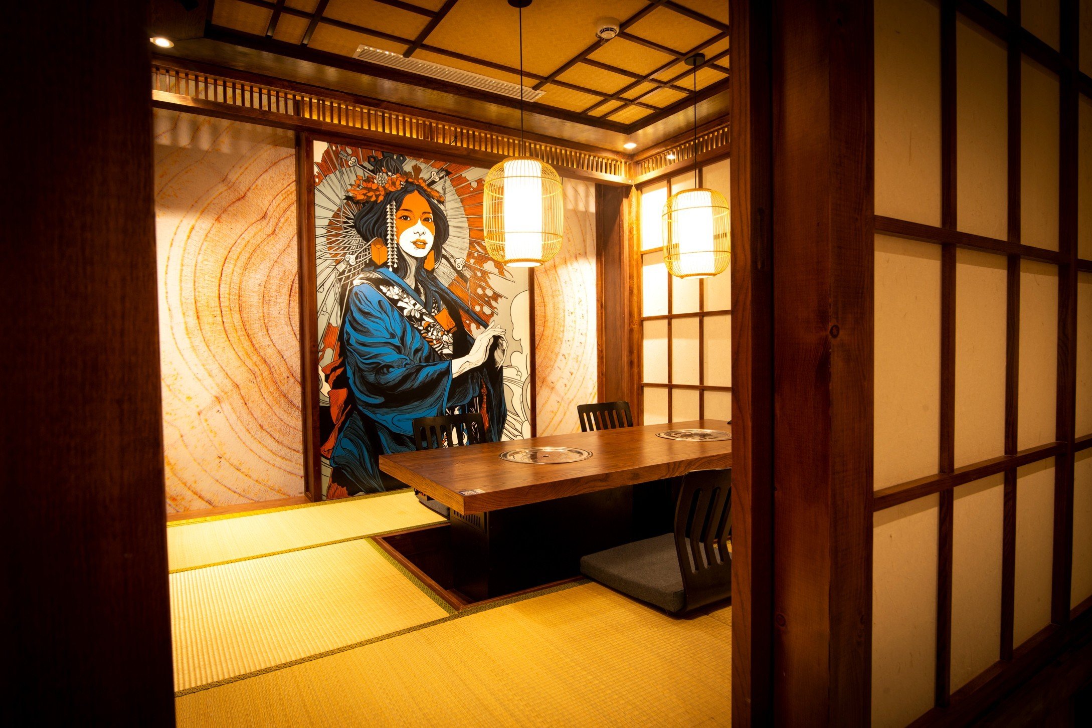 Nếu bạn đang tìm kiếm một không gian ẩm thực đậm chất Nhật Bản, thì những nhà hàng lẩu nướng như Anrakutei Premium, Itaewon và Gyu Shige là những lựa chọn tuyệt vời. Với lối thiết kế tối giản, ấm cúng và sử dụng nhiều đồ gỗ truyền thống, những nhà hàng này mang đến cảm giác gần gũi và thân thiện. Những bức tranh phong cảnh sống động không chỉ trang trí mà còn làm nổi bật tinh thần văn hóa Nhật Bản.