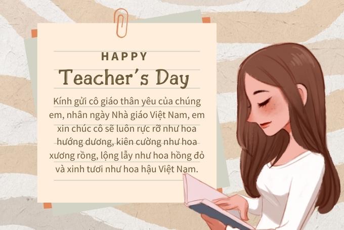 Ngày 20/11 là dịp đặc biệt để chúng ta thể hiện lòng biết ơn sâu sắc đối với thầy cô, những người đã tận tụy dìu dắt chúng ta trên con đường học tập. Nhân ngày này, em xin chúc cô luôn vui vẻ, mạnh khỏe và tràn đầy năng lượng. Cảm ơn cô đã giúp chúng em trưởng thành và tự tin hơn từng ngày.