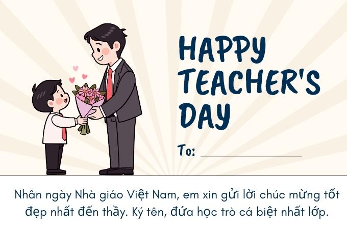 Chúc thầy/cô có một Ngày Nhà giáo thật trọn vẹn, tràn đầy tri thức và niềm tự hào về những thế hệ học trò mà thầy/cô đã dìu dắt. Mong rằng mọi nỗ lực và tâm huyết của thầy/cô luôn được đền đáp xứng đáng. Chúc thầy/cô mạnh khỏe, hạnh phúc, để tiếp tục viết nên những trang sử đẹp cho sự nghiệp giáo dục.