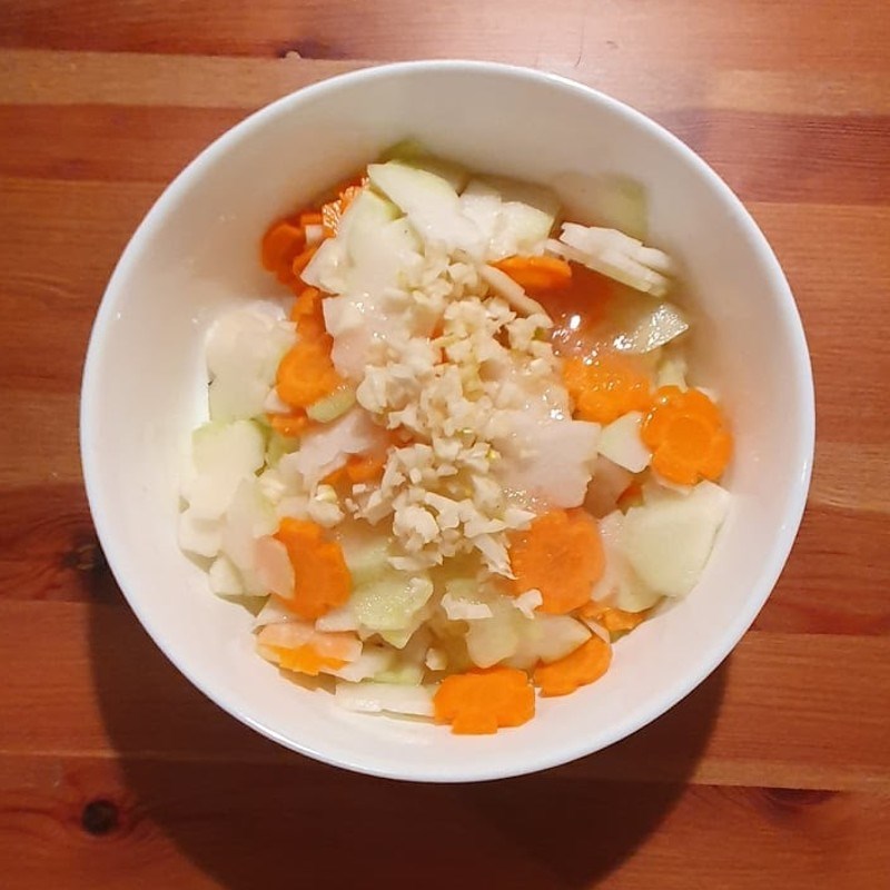 Trong khi chờ đợi, bạn có thể chuẩn bị hỗn hợp nước sốt ướp dưa góp. Hòa tan 2 thìa canh đường, 2 thìa canh giấm, và 1/2 thìa cà phê muối. Đừng quên cho thêm tỏi bóc vỏ đập dập và ớt đã thái lát vào để tăng thêm hương vị. Sau khi ướp, bạn hãy chắt bỏ nước tiết ra từ su hào và cà rốt.