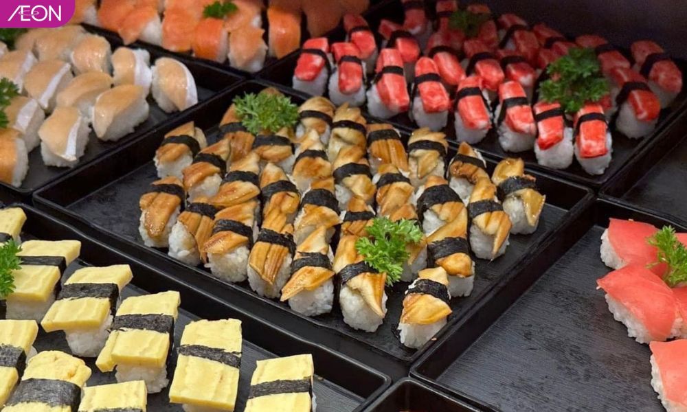 Ngoài ra, bạn cũng có thể khám phá buffet sushi tại AEON Hà Đông, nơi mang đến trải nghiệm ẩm thực Nhật Bản vô cùng phong phú. Đừng quên check-in và thử ngay sushi 5K, một trải nghiệm đầy thú vị cho những ai yêu thích ẩm thực xứ Phù Tang!