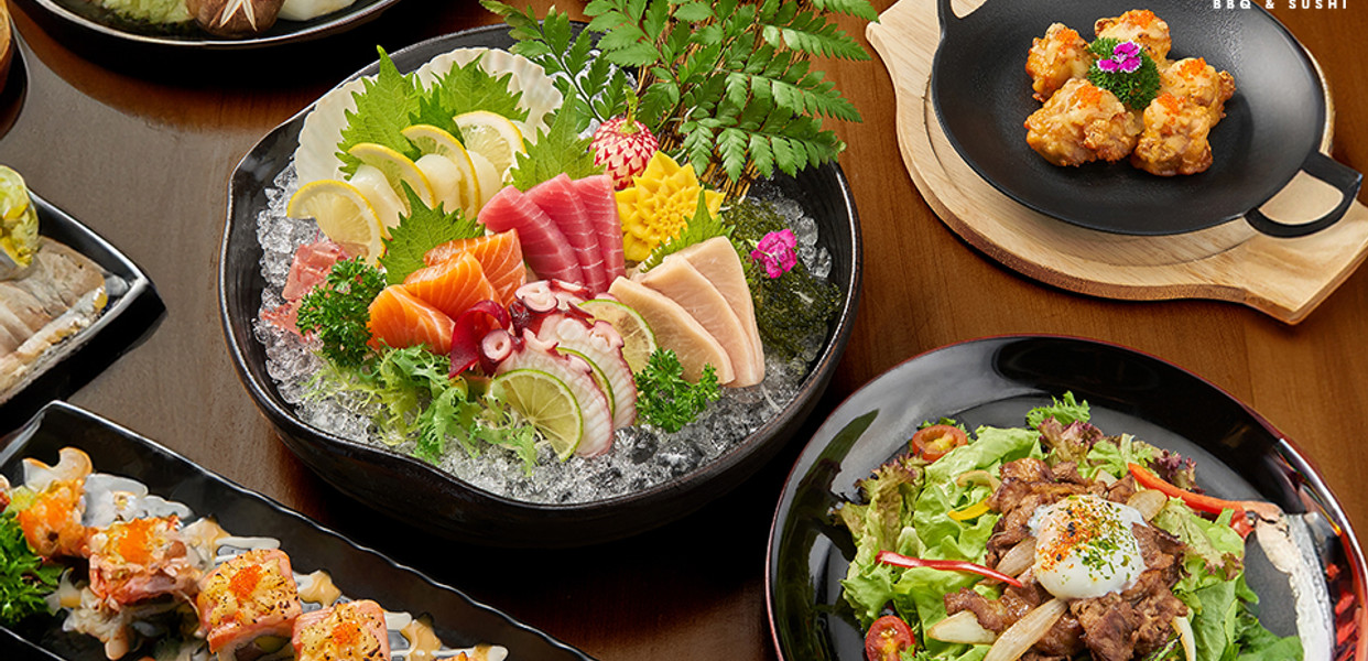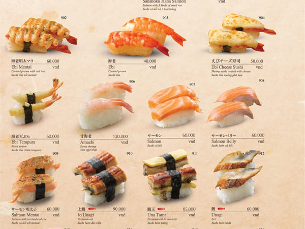 Thực đơn đa dạng với những món ngon như sushi, sashimi tươi ngon, mì soba xào và soup miso sẽ khiến bạn mê mẩn. Đặc biệt, những món ăn độc đáo như há cảo tôm, xíu mại đuôi phụng và bánh bao trứng muối chắc chắn sẽ làm hài lòng cả những thực khách khó tính nhất.