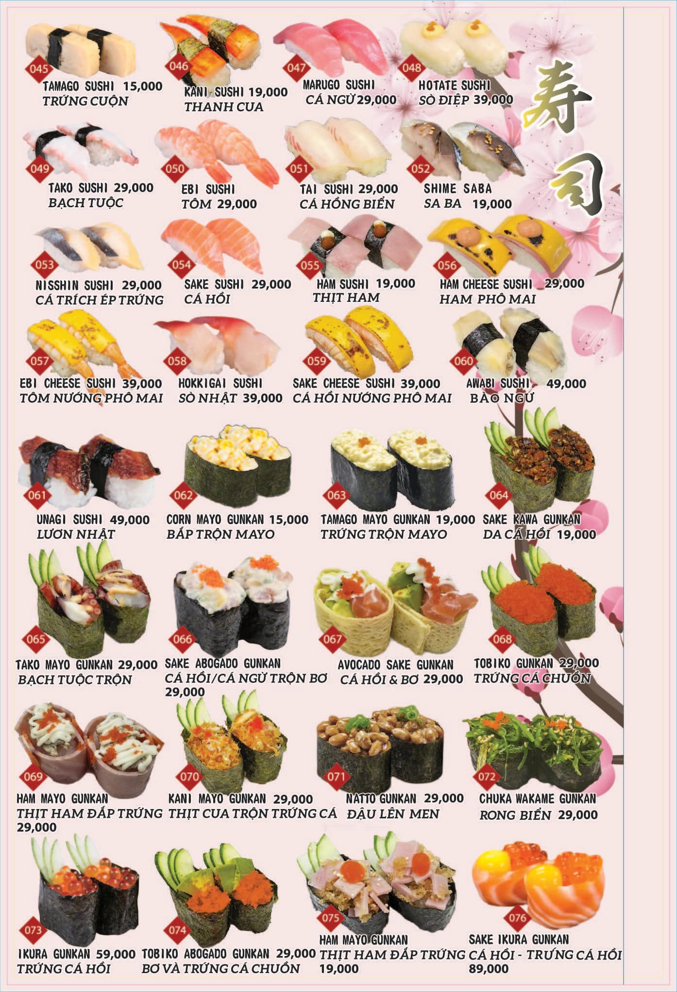 Thực đơn mới của quán không chỉ bao gồm sashimi và sushi combo hấp dẫn, mà còn có những món nigiri và gunkan độc đáo, làm hài lòng cả những tín đồ ẩm thực khó tính nhất. Ngoài ra, quán còn phục vụ các món starter, salad tươi mát và các món nóng như teppan, yaki, hay furai đầy hấp dẫn.