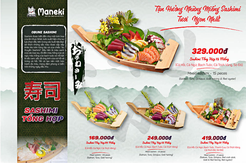Nếu bạn là người yêu thích ẩm thực Nhật Bản, thì chắc chắn không thể bỏ qua menu tại Maneki Neko Deli ở Vincom Biên Hòa. Tại đây, bạn sẽ được trải nghiệm những món ăn tinh hoa nhất như sushi, sashimi, tempura và mì udon. Đặc biệt, menu sushi của nhà hàng có hơn 70 món tươi ngon, đồng giá chỉ 27k/đĩa, rất phù hợp cho những buổi hẹn hò hay gặp gỡ bạn bè.