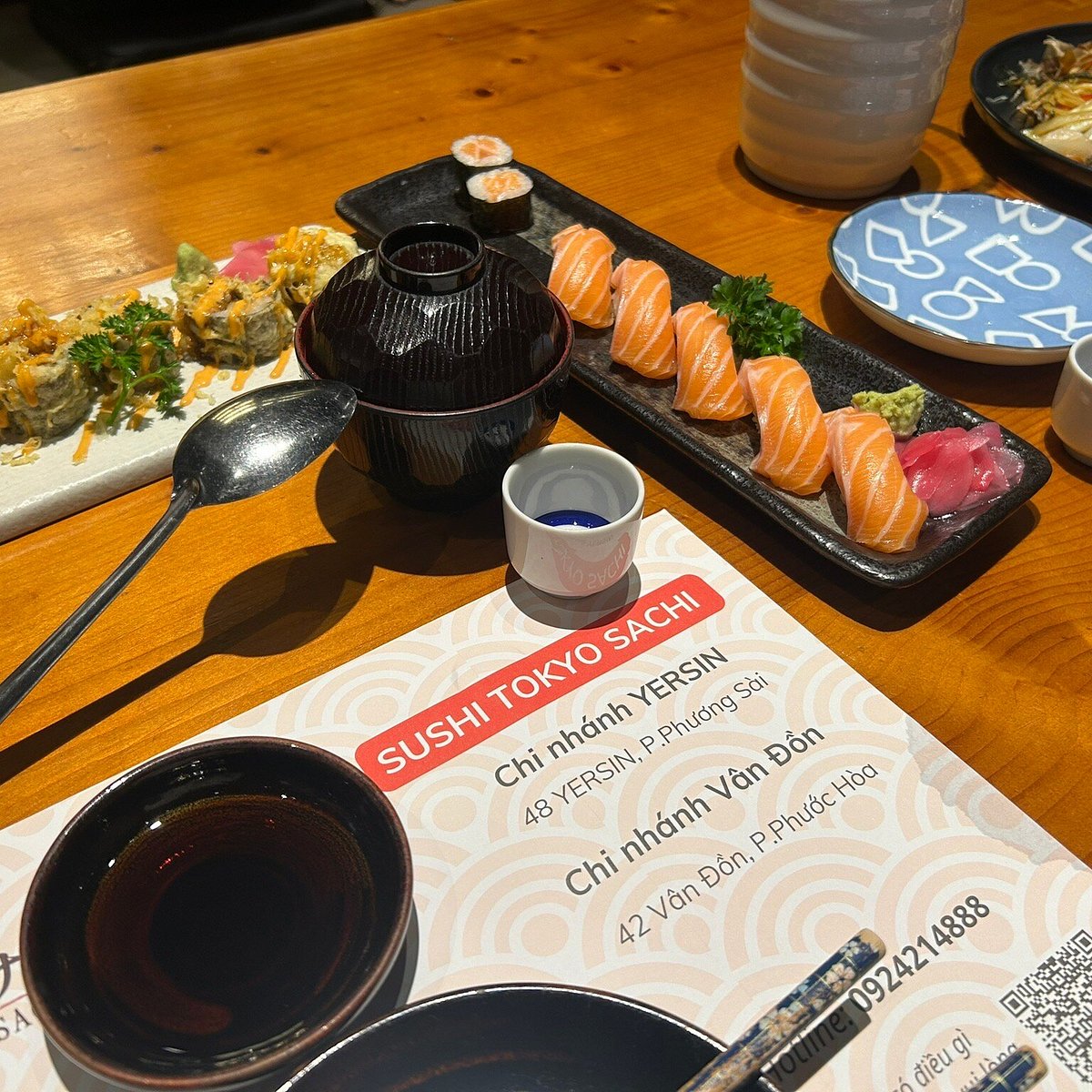 Món ăn ở Sushi Tokyo Sachi rất phong phú, từ sushi cá hồi đến sushi cá ngừ, tất cả đều được lựa chọn nguyên liệu kỹ lưỡng và chế biến tinh tế. Bạn có thể tận hưởng hương vị tươi ngon, đậm đà mà không lo về chất lượng. Ngoài ra, quán còn có một chi nhánh khác tại số 42 Vân Đồn, Phước Hòa, tạo điều kiện thuận lợi cho những ai ở khu vực khác.