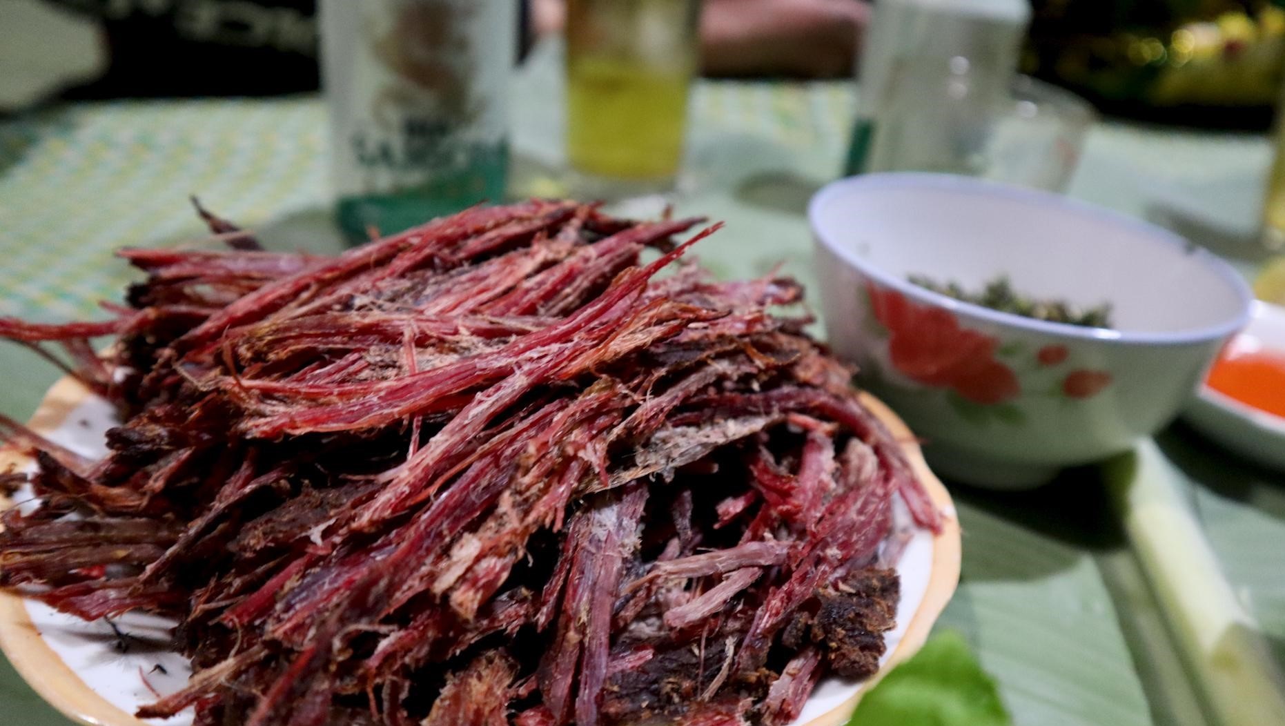 Thịt trâu gác bếp là một món ăn đặc sản được nhiều người yêu thích, không chỉ vì hương vị độc đáo mà còn vì lợi ích dinh dưỡng của nó. Một điểm đáng chú ý là trong 100g thịt trâu gác bếp chỉ chứa khoảng 240 đến 260 calo. Điều này tương đương với khoảng 1/10 nhu cầu calo hàng ngày của cơ thể người trưởng thành.
