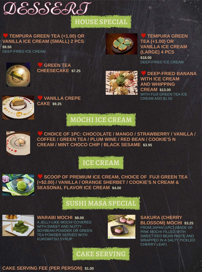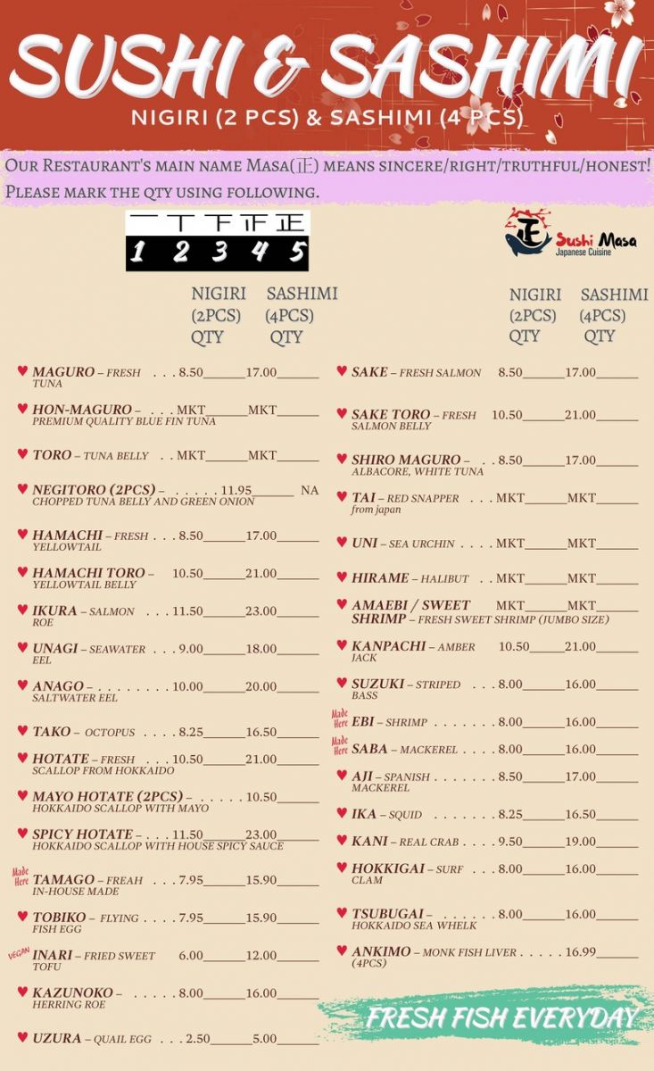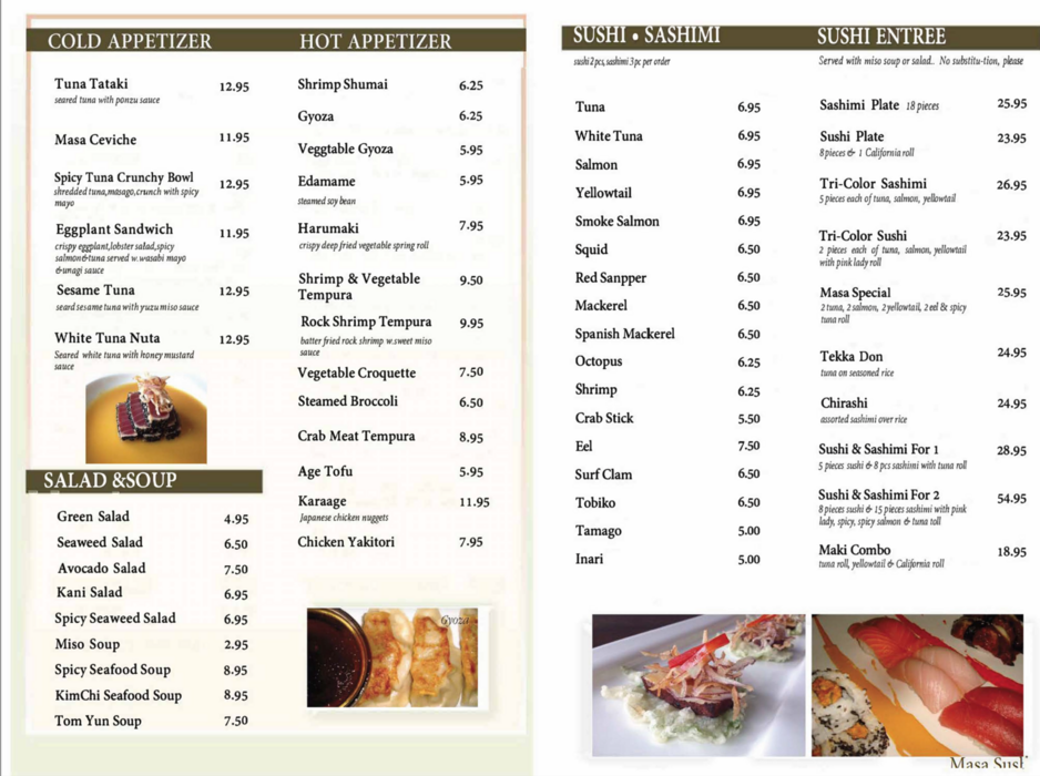 Tại Sushi Masa, thực khách sẽ được trải nghiệm tinh hoa ẩm thực Nhật Bản qua một thực đơn phong phú với hơn 250 món ăn. Đội ngũ đầu bếp tài hoa đã chăm chút từng chi tiết để mang đến những món ăn đặc sắc, từ những loại Premium Sashimi tươi ngon đến các cuốn Sushi độc quyền mà chỉ riêng Sushi Masa mới có.