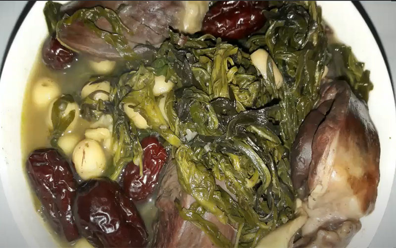 Tiếp theo, đổ khoảng 1 lít nước sôi vào nồi, thêm hạt sen và táo tàu, rồi hầm trong khoảng 30 phút. Món ăn sẽ trở nên hấp dẫn hơn khi được kết hợp với ngải cứu tươi mát. Ngải cứu không chỉ giúp tăng thêm hương vị mà còn mang lại nhiều lợi ích cho sức khỏe, đặc biệt trong việc bồi bổ chức năng tim mạch.