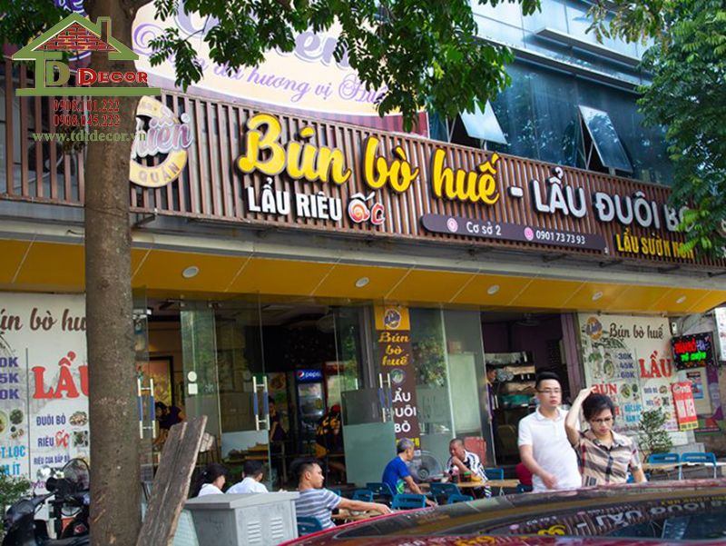 Ngoài ra, màu sắc cũng đóng vai trò quan trọng. Các gam màu như đỏ cam thường thấy trên bảng hiệu bún bò Huế không chỉ gợi cảm giác ấm cúng mà còn khơi gợi vị giác của thực khách. Những mẫu bảng hiệu độc đáo và ấn tượng sẽ giúp quán tạo dấu ấn riêng, thu hút được nhiều khách hàng.