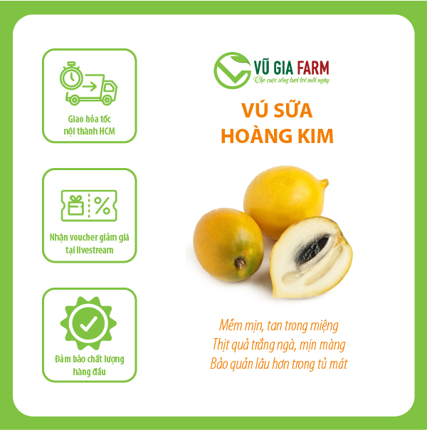 Vú sữa là một trong những loại trái cây đặc sản của Việt Nam, được nhiều người ưa chuộng nhờ hương vị ngọt ngào và giàu dinh dưỡng. Hiện tại, giá vú sữa Loại 1, đặc biệt là vú sữa Hoàng Kim, dao động từ 150.000 đến 200.000 đồng/kg. Loại vú sữa này có trọng lượng khoảng 3 quả/kg và nổi bật với màu vàng óng, hình dáng đẹp mắt.
